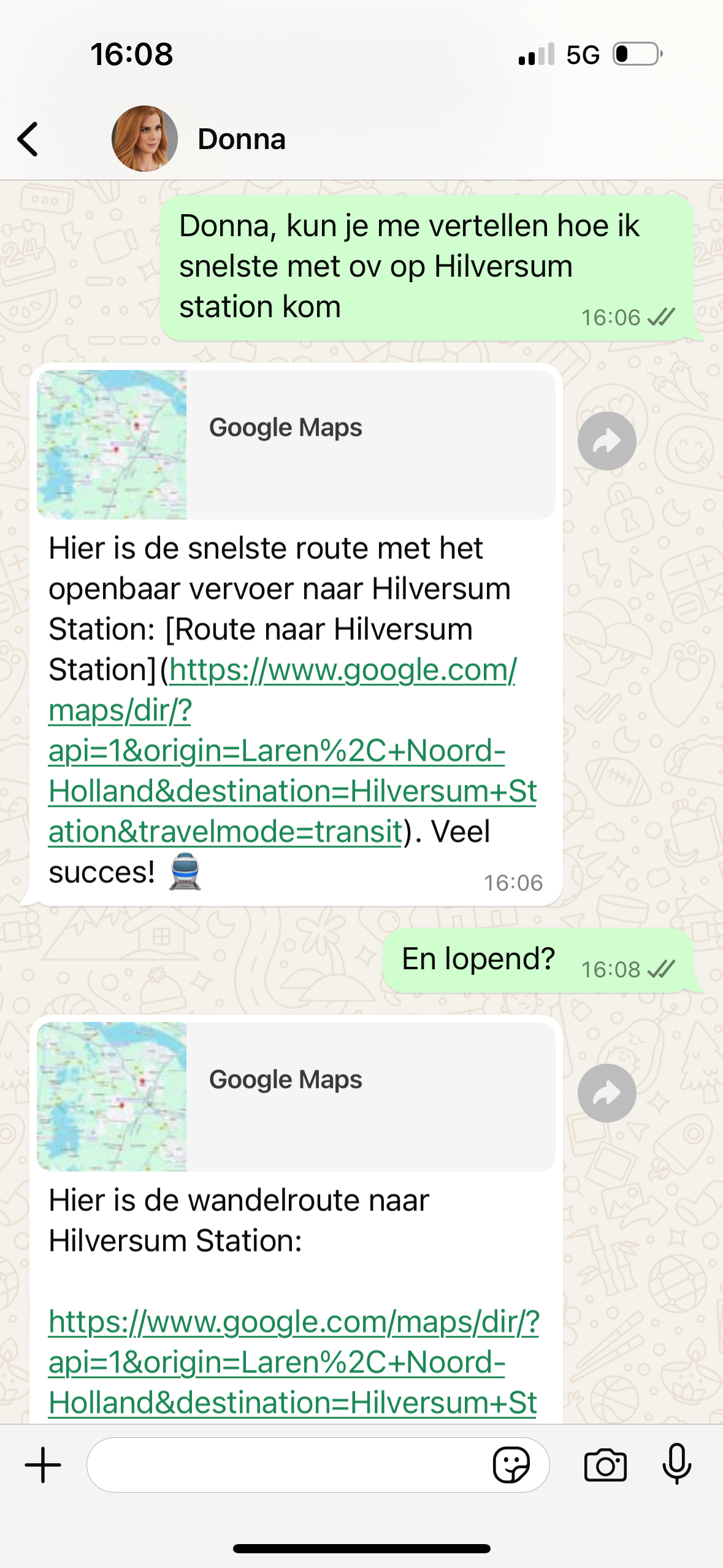 Vraag Donna om een routebeschrijving en ze stuurt dit direct via Google Maps.